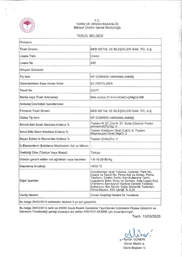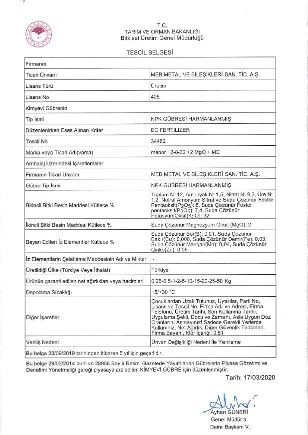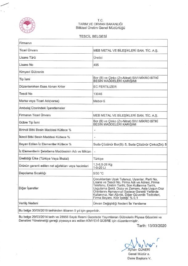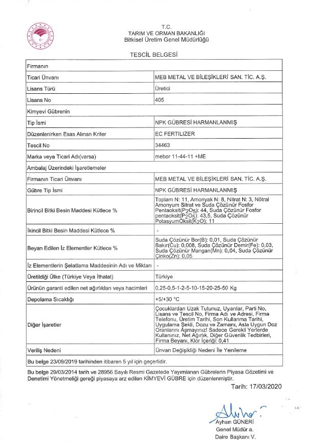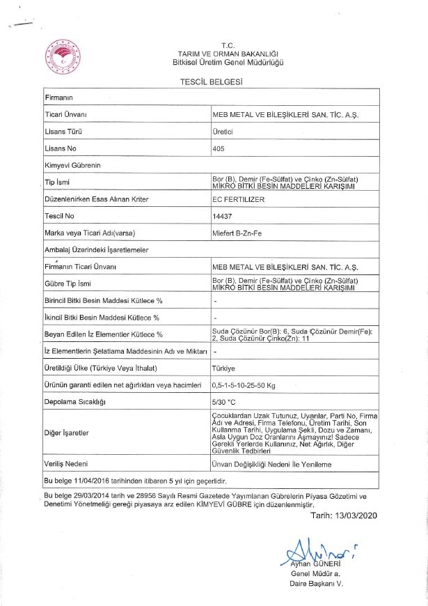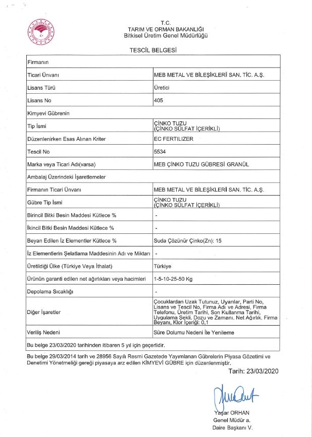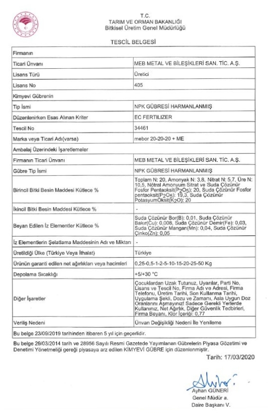 MEB ÇİNKO SÜLFAT KRİSTAL TESCİL MEBOR 20-20-20 TESCİL