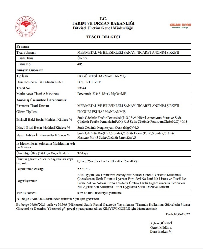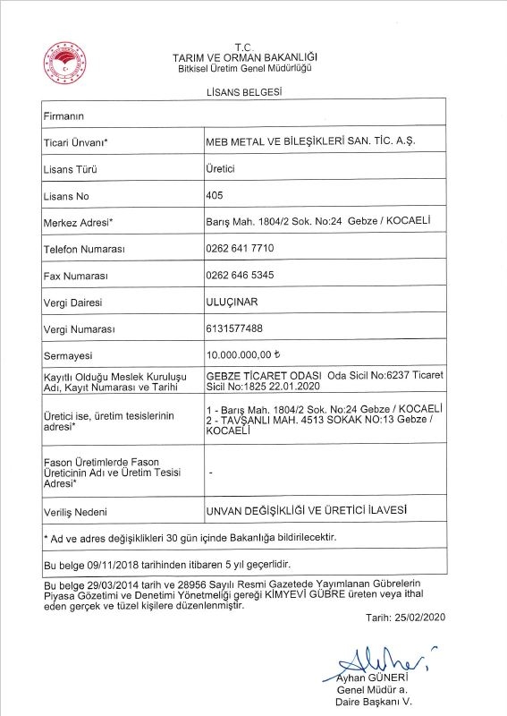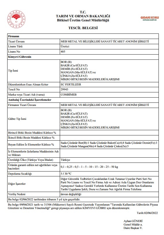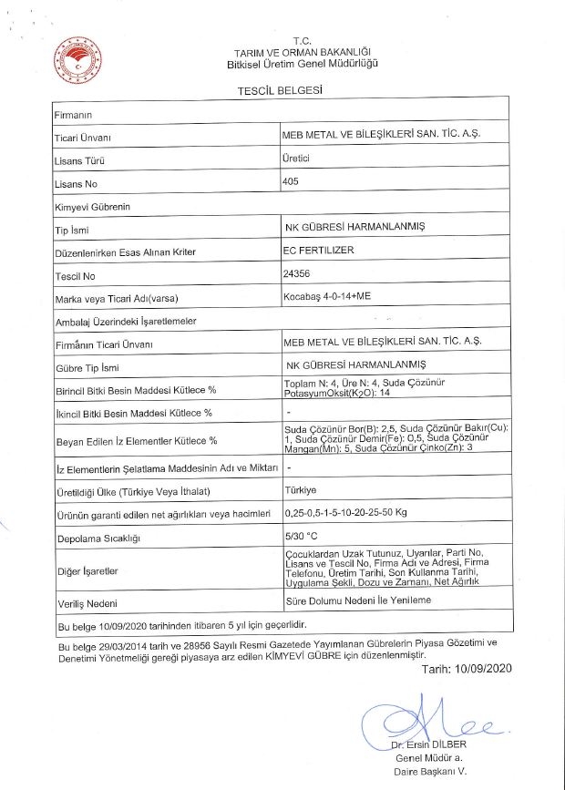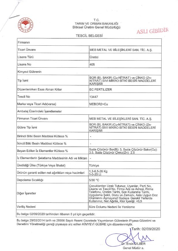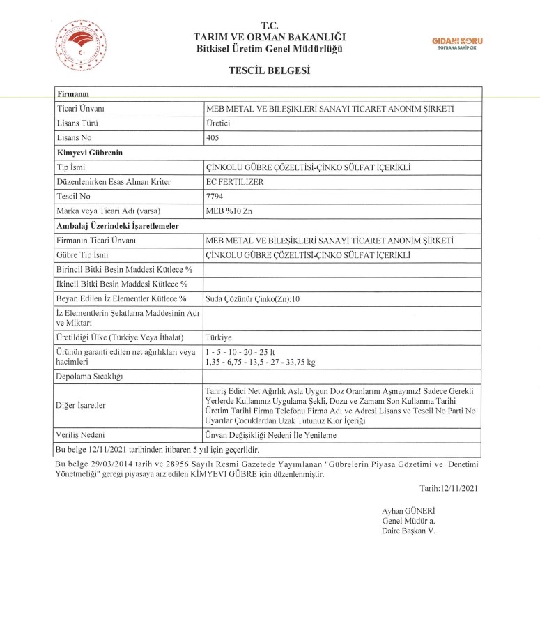MEB ÇİNKO SÜLFAT KRİSTAL TESCİL MEBOR 20-20-20 TESCİL