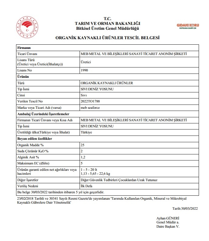 ORGANİK TESCİL BELGESİ MEB SEAFORCE ORGANİK TESCİL BELGESİ MEB AMİNOFORTİS
