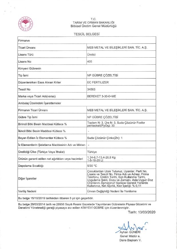 BEREKET 3-30-0 TESCİL BEREKET 5-25-0 TESCİL