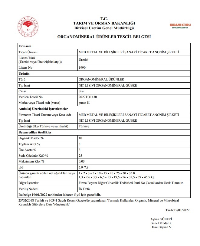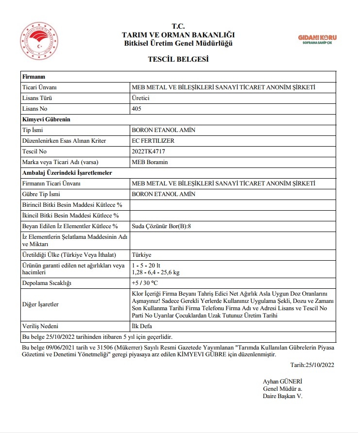 MEB BORAMİN TESCİL ORGANİK TESCİL BELGESİ PUNTO-K